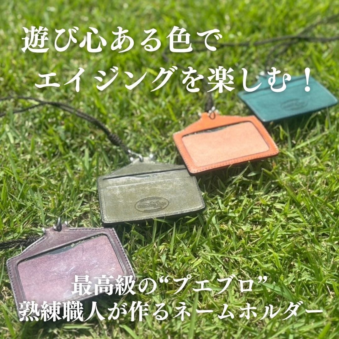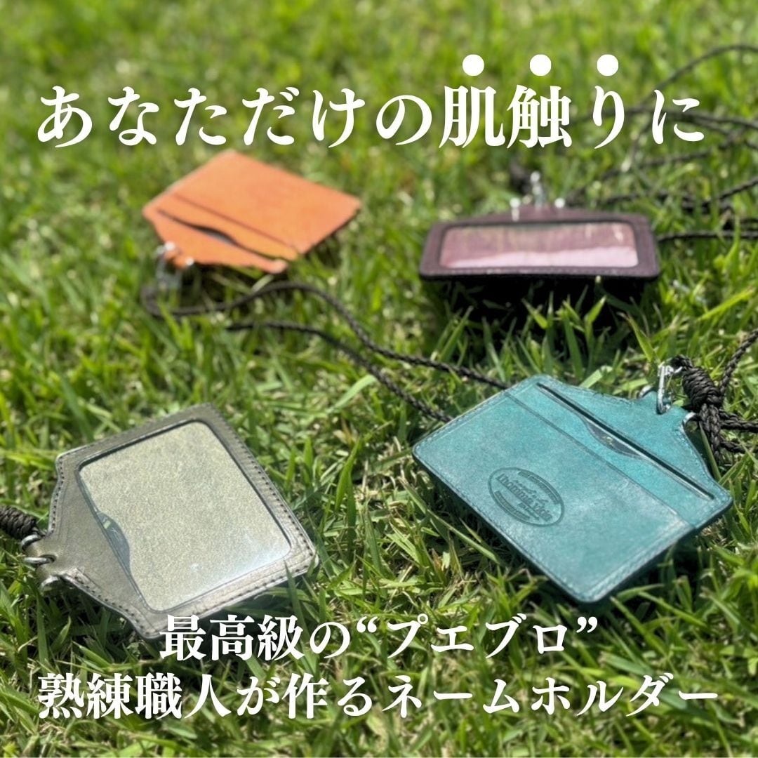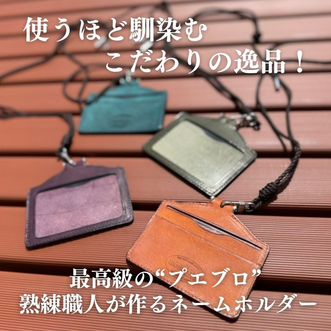 A .(合同会社Trust Elements)代表の川野邊がデザインをし、熟年職人と試行錯誤しながら、作られた高級本革のネームホルダーです。遊び心のあるカラーバリエーションで、プエブロレザーを使いエレガントな外観を演出。(首からかけるストラップ付き)